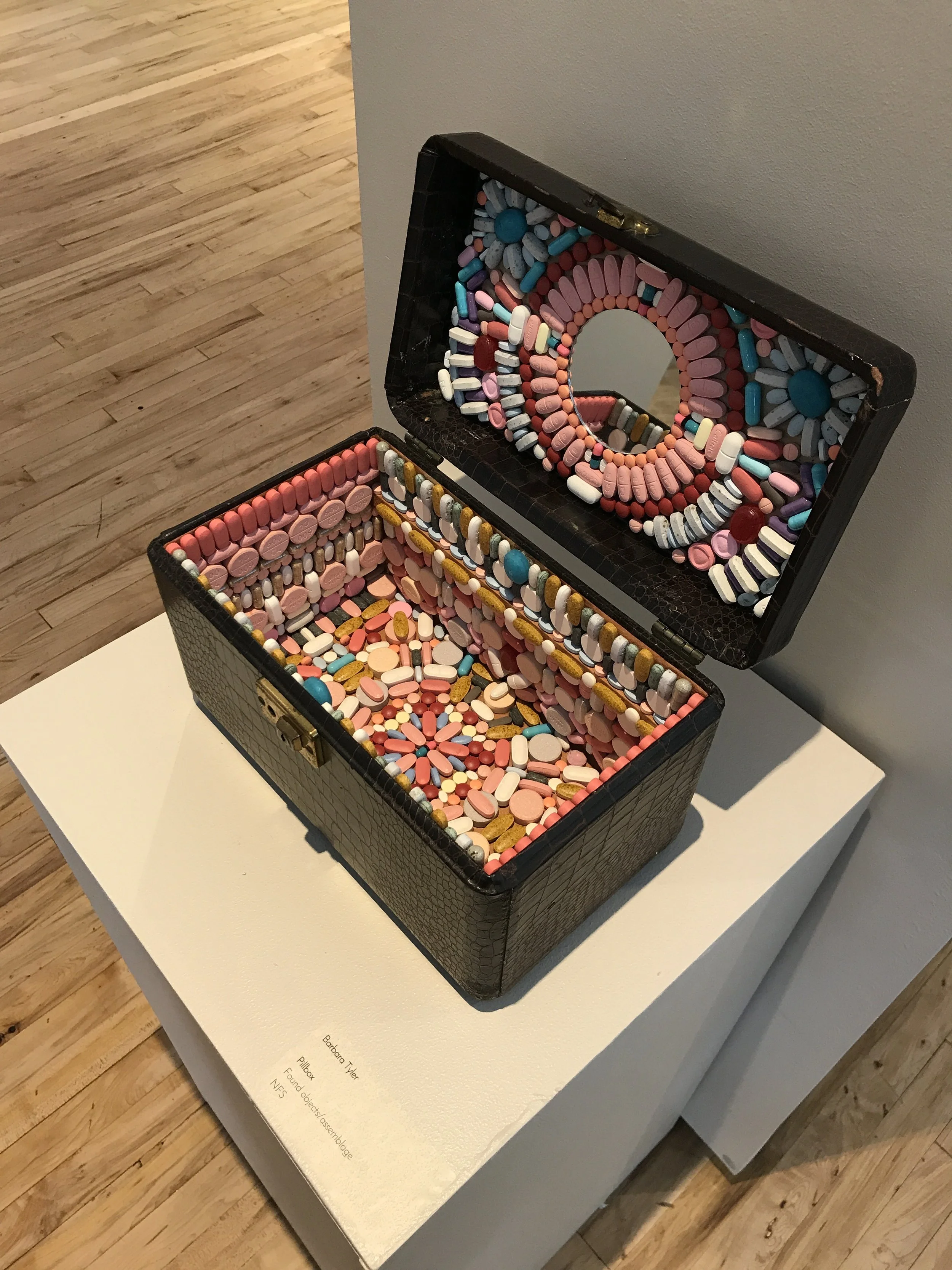 Pillbox (Found objects and assemblage, 12.25 x 11.5 x 10.25) Among the items found in downsizing my in-laws’ home were unconsumed medications. Using both prescription and over-the-counter medicines, pills became a medium and were selected for color, shape and texture. Arranging them in a small suitcase, these leftover items become part of a type of canopic jar collection.