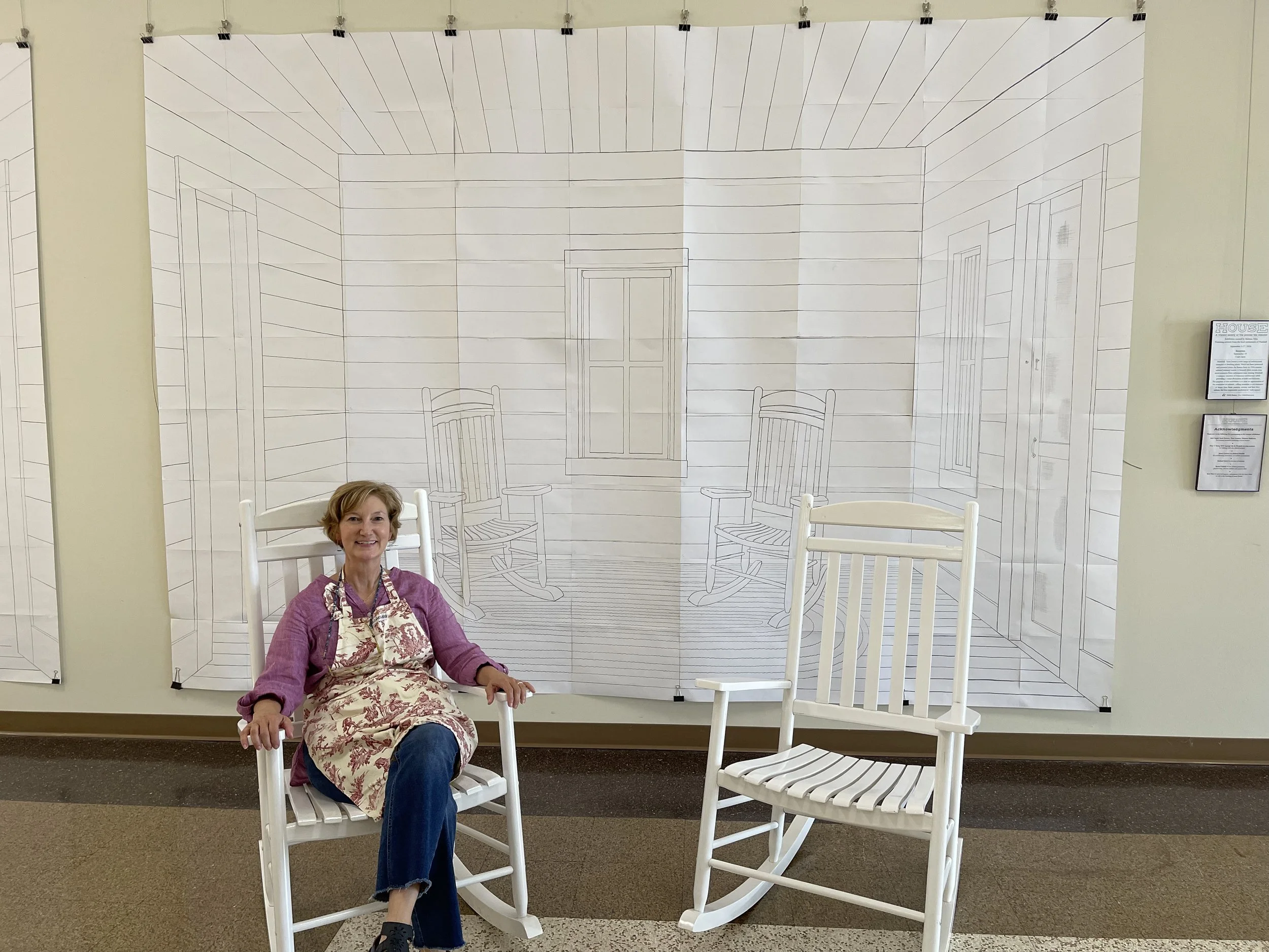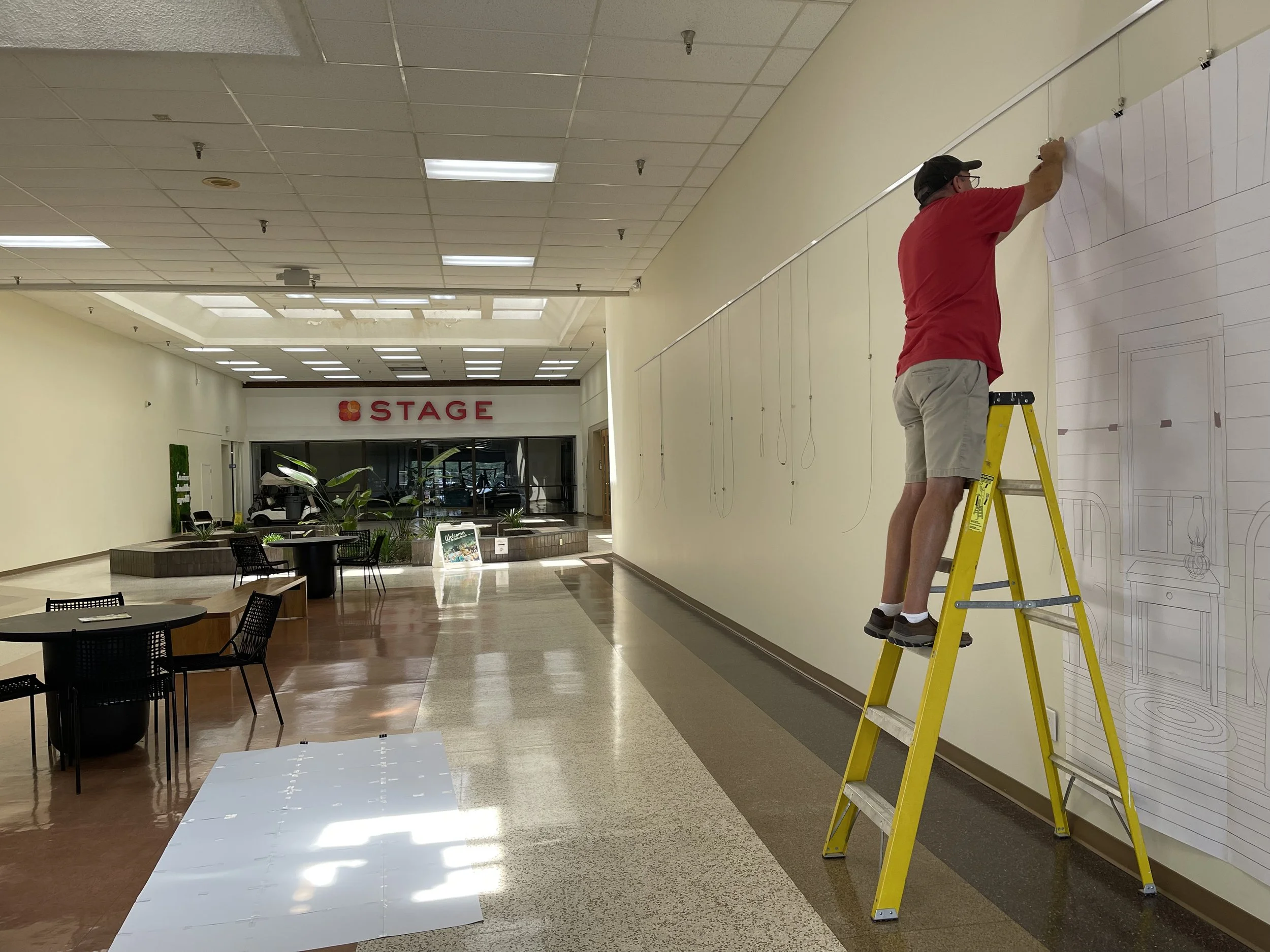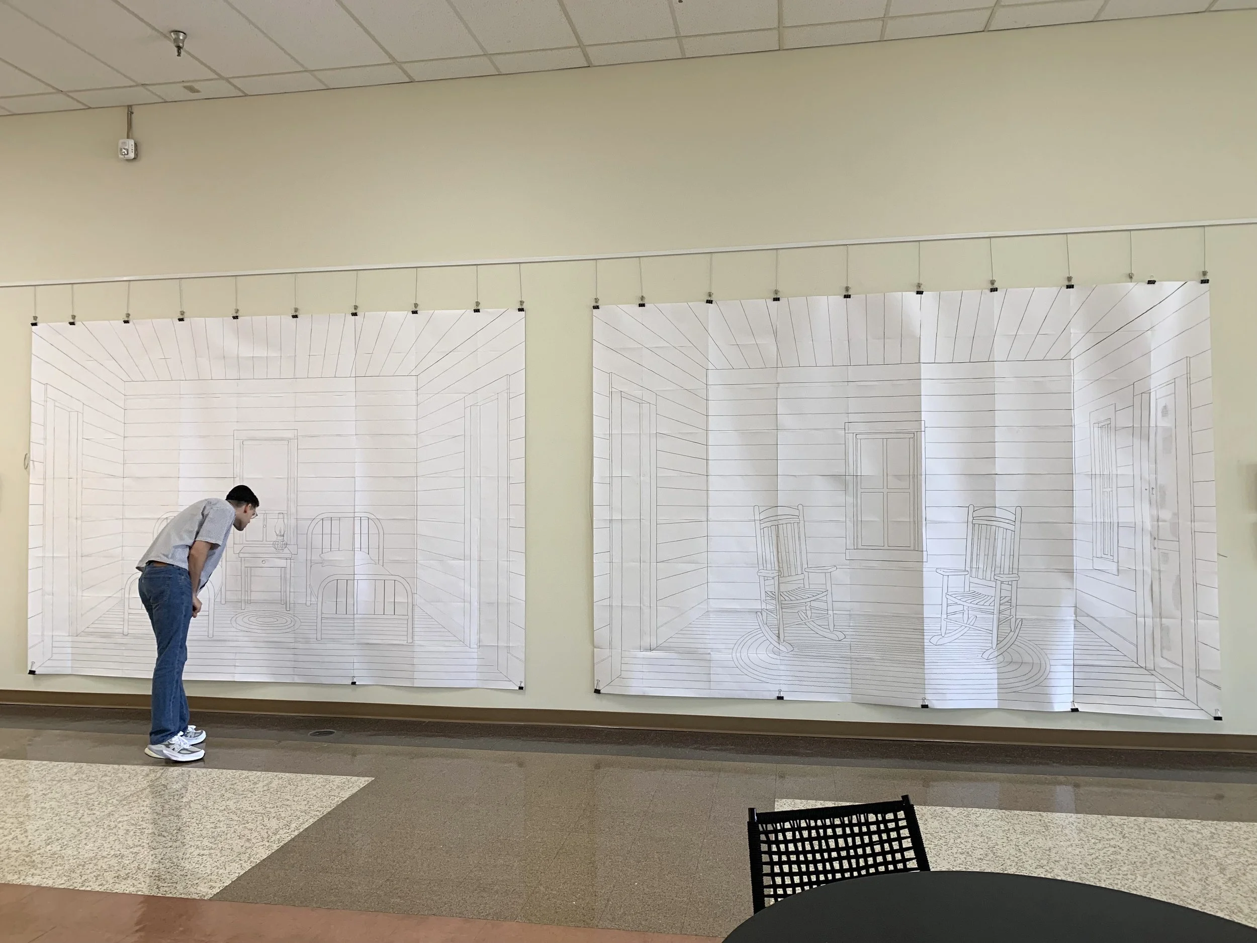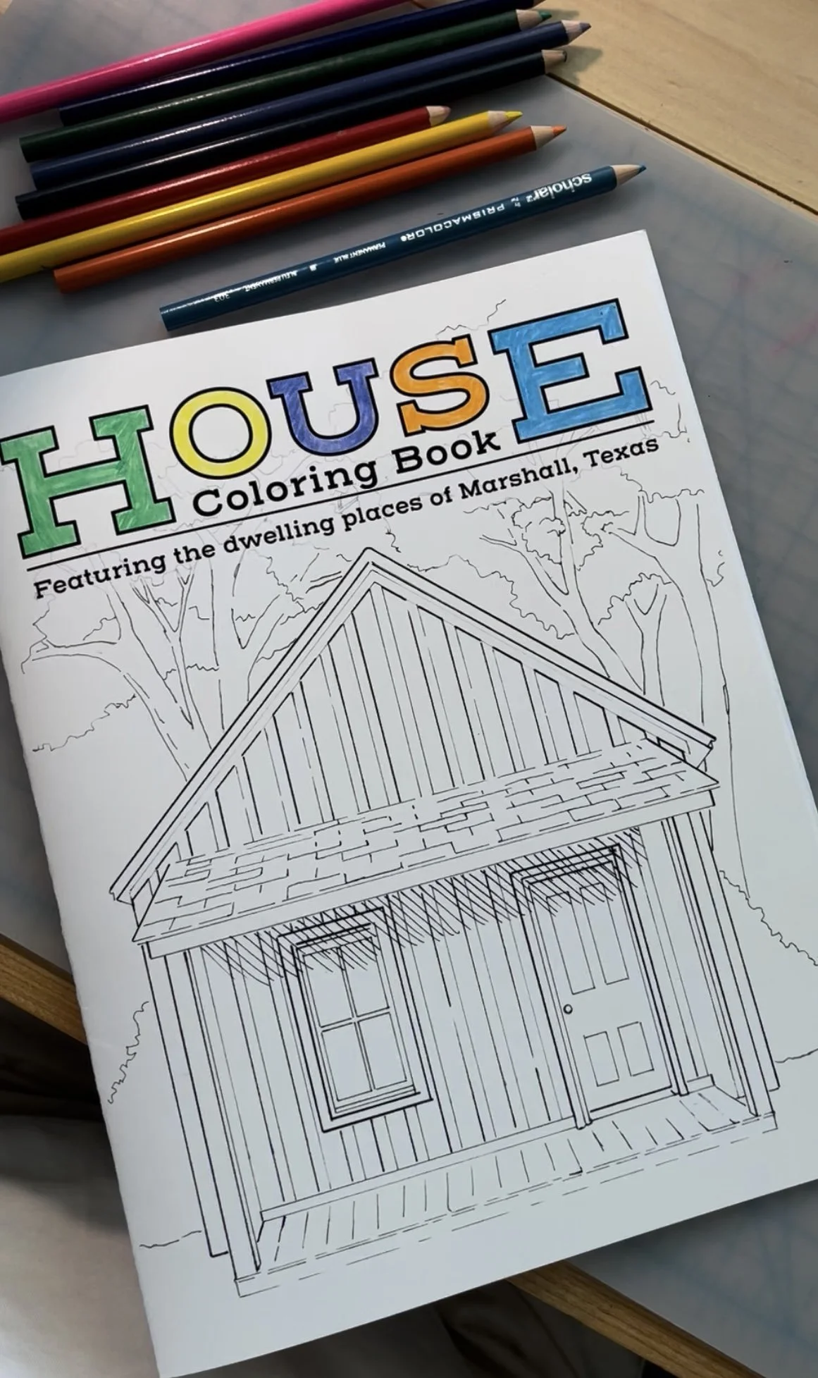 HOUSE is a site-specific installation exhibited at a repurposed mall turned art gallery in Marshall, Texas. The narrow, cavernous space was the inspiration for what developed into two large drawings of the interior of a shotgun house. The concept expressed fitting a structure, namely a dwelling where a family live and gather, within a separate, larger building used for community gatherings. Other components of the exhibition included artwork by local fourth- and fifth-grade students as well as a curated selection of area artists’ depictions of historical houses in Marshall. Displays detailing the process of the large-scale drawings informed viewers about image enlargement for art installations. A companion coloring book featuring visual examples of the town’s abundant architectural heritage was introduced at a reception for the community.