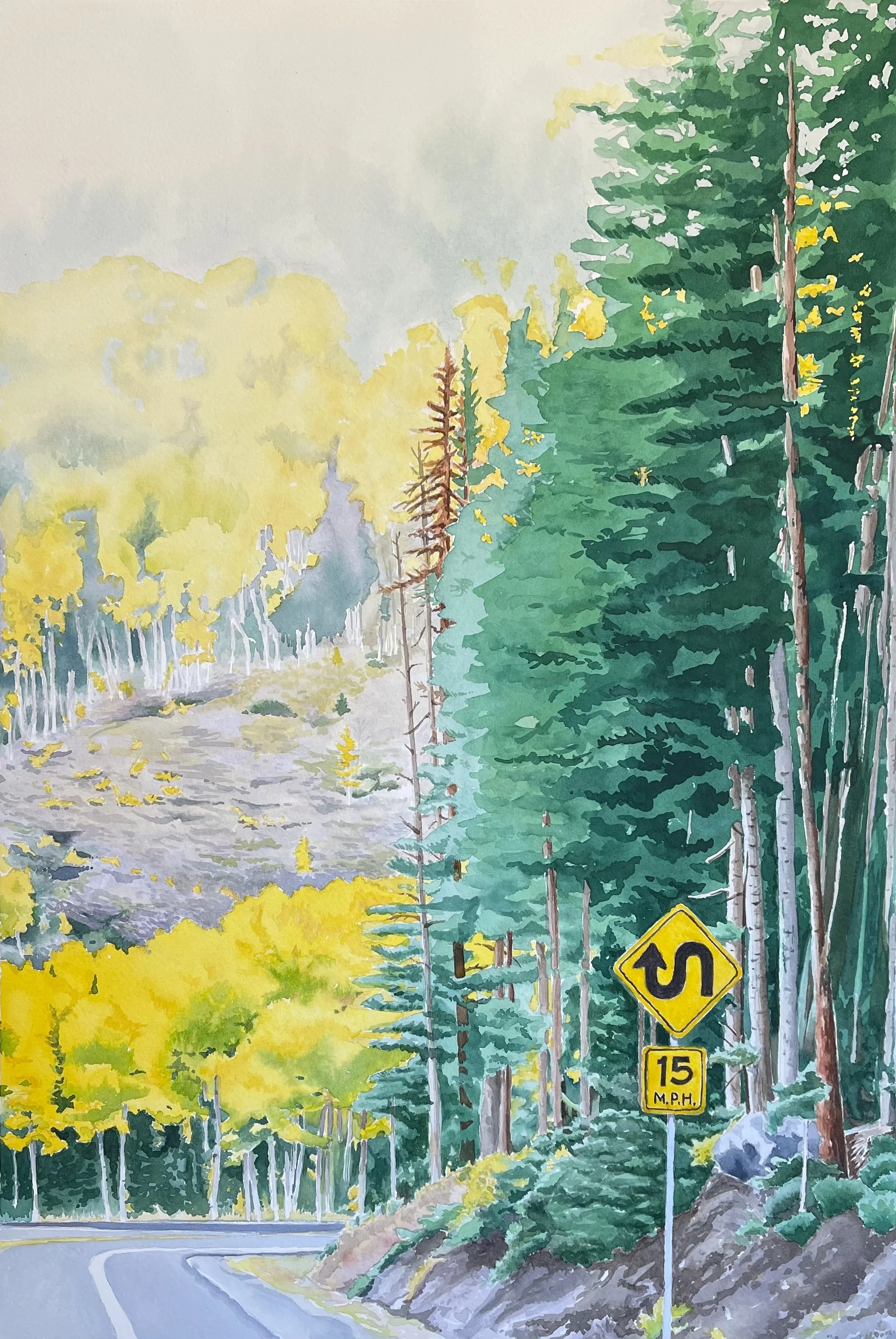 Aspen Curve (Watercolor, 21.5 x 14.5) Often while traveling on road trips, the driver can’t (or won’t) stop for photographic opportunities. By including road signage in final compositions, tension is achieved highlighting the ongoing human vs. nature struggle (as well as that of driver vs. passenger).