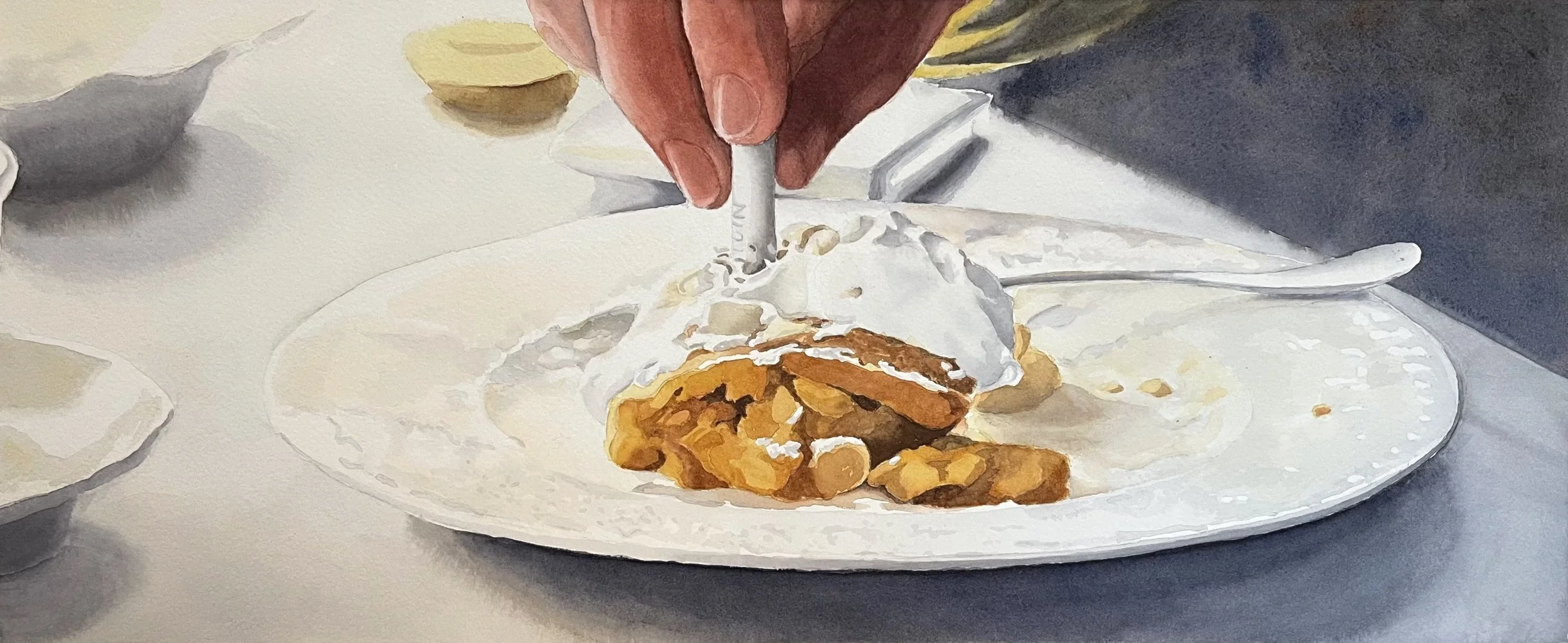 Extinguish (Hans attempts to snuff out a perfectly blameless French strudel) (Watercolor, 7.75 x 18.75) In the series, Titled Movie Stills, paused moments of film cinematography are combined with poetic lines to form ‘sub’ titles.